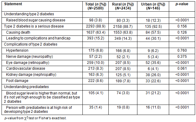 Overall, urban inhabitants had significantly better knowledge than rural inhabitants. That is, urban people were more likely to know that 'Diabetes is the raised blood sugar status causing disease' (12.3% vs 3.3%),'T2D causes many serious complications' (30.1% vs 14.3%). Similarly, with regards to prediabetes, urban people were more likely than rural ones to know that 'Blood sugar level is higher than normal, but it's not yet high enough to be classified as type 2 diabetes' (21.2% vs 3%), and 'Person with prediabetes is at high risk of developing type 2 diabetes' (11% vs 0.8%).