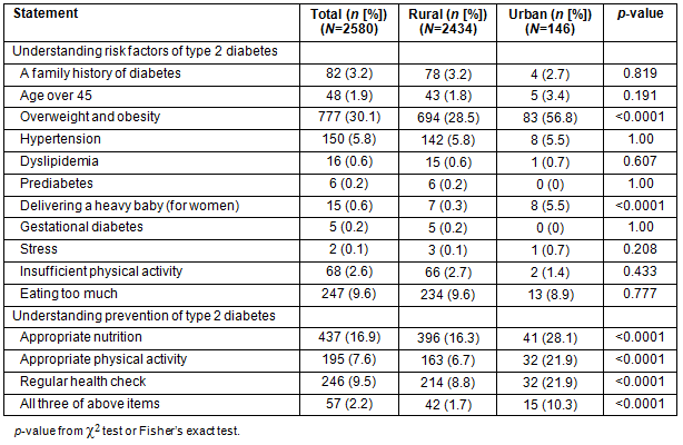 Rates of knowing about appropriate nutrition, physical activity, and regular health checks to prevent T2D were 16.9, 7.6, and 9.5%, respectively; only 2.2% of subjects understood all three methods (Table 2). There were 77.5% of participants who did not know any preventive methods, 13.2% who understood one method, and 7.1% who understood two methods. Knowledge of T2D prevention was much lower in rural areas than urban areas. Rates of understanding all three methods was 10.3% in urban areas and 1.7% in rural areas.