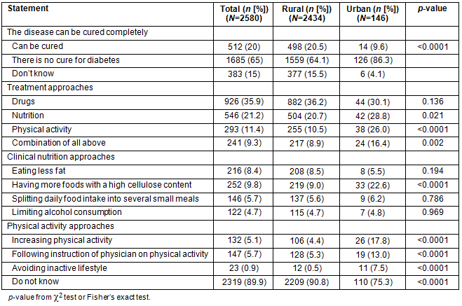 In general, knowledge of T2D treatment was significantly lower in rural areas than in urban areas (Table 3). The rate for the combination of all three approaches for T2D treatment was 8.9% in rural areas and 16.4% in urban areas. Among the three approaches, the significant difference between rural and urban areas was found in knowledge of the physical activity approach.
