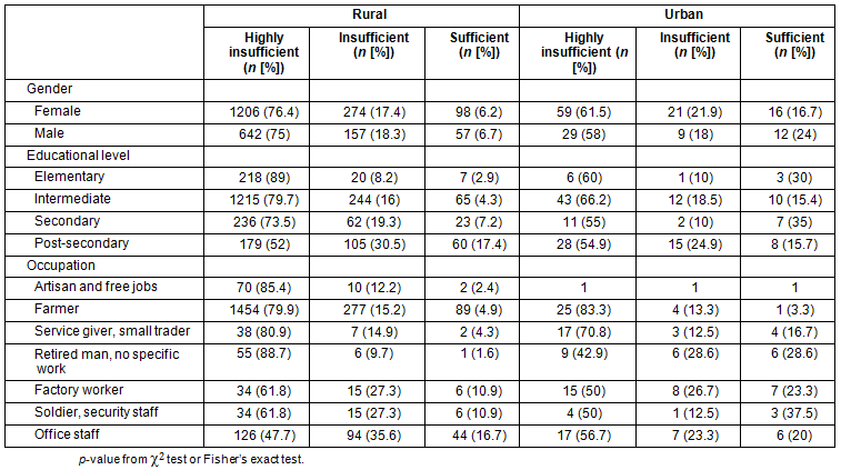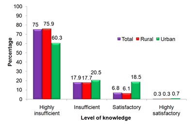 Attitudes towards T2D are shown in Table 4: more than 88% of inhabitants disagreed with the statement 'Treatment of T2D and its complication is not necessary', 75% of the population agreed with 'Drugs are the most important in treatment approaches for T2D', 60% disagreed with 'Modification of lifestyle and nutrition is not effective in controlling type 2 diabetes'. Regarding the statement 'Drugs are the most important in prevention of type 2 diabetes?', 54.5% agreed, 33.2% disagreed, and 12.3% did not know. Rates of correct attitudes towards T2D were significantly higher in urban areas than in rural areas, except for the question on the effectiveness of lifestyle modification and nutrition in T2D control. In terms of the comprehensive knowledge about T2D, risk factors, prevention and treatment of the disease, three out of four (75%) inhabitants had highly insufficient, 17.9% had insufficient, 6.8% had satisfactory and 0.3% had highly satisfactory knowledge levels (Fig2). The three levels (highly insufficient, insufficient, and sufficient) of T2D knowledge by gender, occupation, and educational level are shown in Table 5. Knowledge levels varied with occupation and educational level (p<0.0001). The sufficient knowledge rates were 3.9-17.2% by educational levels, and 3.4-17% by occupations. Knowledge level increased with educational level. The rate of sufficient knowledge was higher in urban areas (19.2%) than in rural areas (6.4%).