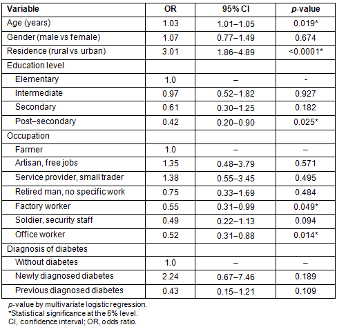 Table 6 shows the factors associated with inadequate knowledge on T2D control in multivariate logistic regression. Age, residence, educational level, and occupation were the most significant factors associated with inadequate knowledge. Gender and diabetes status were not significantly associated with inadequate knowledge.