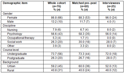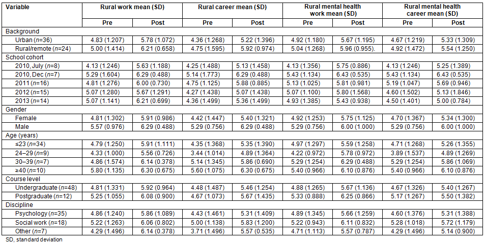 Table 1 shows the demographic profile of participants. The majority of the matched pre- and post-matched sample was female. The median age of matched pre-post participants was 23.0 years and the mean age was 38.74 years (standard deviation (SD)=11.3 years; range 20-59 years). Over half of the matched pre-post student cohort was studying psychology, while almost a third were social work students. The majority of students were in their third or fourth year of undergraduate studies. Urban background students constitute over half of this cohort. Twelve students had undertaken a mental health clinical placement, seven participants had undertaken a rural placement and one student had undertaken a rural mental health placement prior to attending the vacation school.