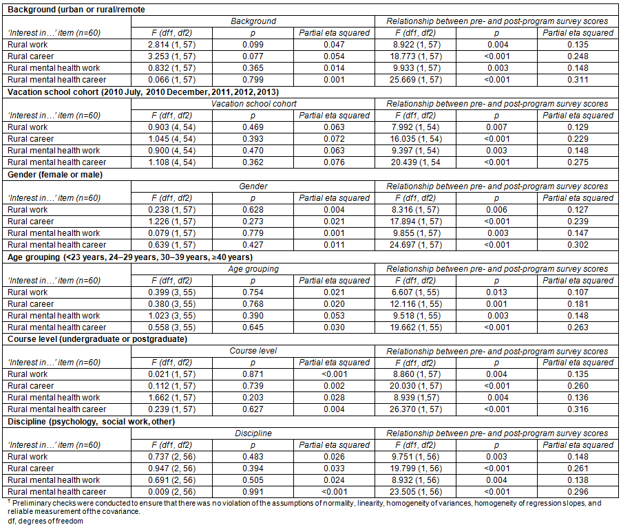 The largest and significant change in scores were all associated with the rural variables, and least and non-significant change in interest in the two mental health items. The findings show stronger effect sizes for participants' interest in working and a career in a rural area as well as rural mental health work. Overall, the results indicate that the significant improvement in pre- to post-program scores for working and career in a rural area and rural mental health work are a consequence of participating in the vacation school program.