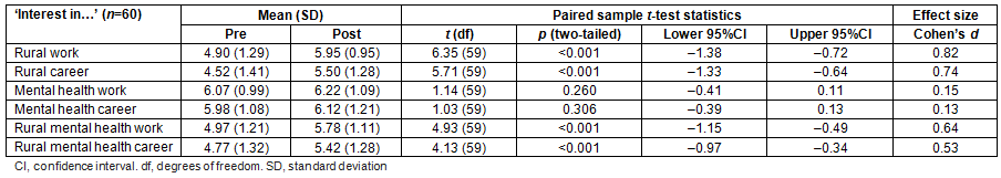 The findings highlight that a brief (5-day) program can change students' interest in working and living in a rural area, particularly the significant increase in pre- to post-program interest in relation to all of the rural and rural mental health variables. This was illustrated by a strong effect size for interest in rural work, and medium effect size for career in a rural setting, interest in rural mental health work and a career in rural mental health. This is consistent with the previous findings of the initial pilot study18.