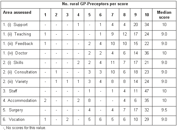 Participants: All 64 final-year medical students who undertook a general practice attachment in one of four groups during the year 2000 were required to complete GP-preceptor evaluation questionnaires following the attachment. Sixty-four rural and 76 urban GP preceptors were assessed.