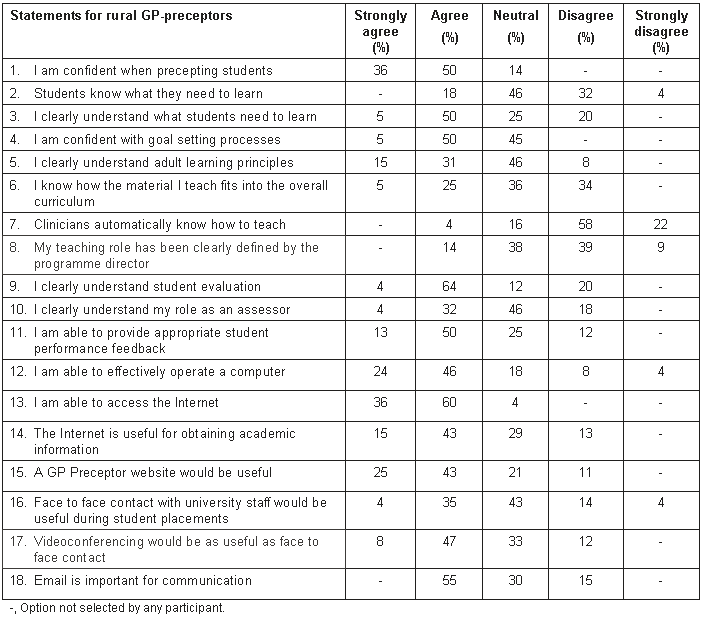 - The first section was designed to reflect the profile of rural GP preceptors. This section also provided data to determine the level, qualification and professional experience relevant to clinical teaching, and the level of staff-development activity that had been undertaken to prepare the teacher for the teaching role.