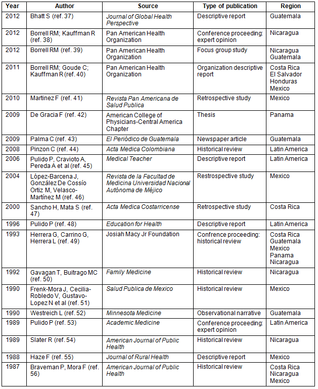 Twenty articles were analysed in depth37-56. There is a significant paucity of research related to medical education preparing physicians for rural practice in continental Central America. Additionally, few articles described in depth or evaluated specific rural medicine educational initiatives in this geographical territory. Therefore, data were extracted primarily from expert opinion articles. Table 1 summarizes these articles and sources of data37-56. The 20 articles included six historical reviews44,49-51,54,56, five descriptive reports from non-governmental organizations37,40,45,48,55, three retrospective studies41,46,47, two expert opinions extracted from conference proceedings38,53, one focus group study39, one thesis42, one observational narrative52 and one news report43. Articles ranged in publication date from 1987 to 2012.