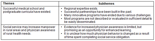 Theme 2. Social service may increase manpower in rural areas and physician awareness of rural health needs: A retrospective study from Mexico46 revealed that the collaboration between the Ministry of Health and the Ministry of Education has been successful at assigning young physicians to serve in rural areas during their social service commitment time. In some countries, such as Mexico49 and Costa Rica49, there is some evidence suggesting that social service time may result in indirect education and sensitization of the physicians to the impact of the psychosocial factors on health and disease49. Physicians completing their rural social service commitment are exposed to the same psychosocial and ecological environmental conditions as their patients, helping them learn about non-biological factors that affect illness49. However, more robust research is needed to better understand the degree of impact of this exposure and whether this changes physician behavior.
