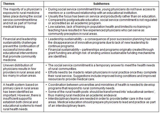 Qualitative analysis of the content of the 20 articles revealed several themes and subthemes (Tables 2-4) related to the structure and content of medical education specific to rural health in continental Central America. Some successful educational programs were described. However, there appear to be many common challenges faced by countries in this region, prompting several authors to propose suggestions for improvements in rural medicine education for physicians and medical students.