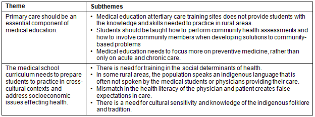 Theme 2. The medical school curriculum needs to prepare students to practice in cross-cultural contexts and address socioeconomic issues affecting health: Language is a major obstacle to providing high-quality care in some rural communities. Native populations sometimes speak dialects requiring translation. In countries such as Panama42 and Guatemala37, the indigenous population often do not seek health care, as providers do not speak their language and professional translation is not available. It has also been observed that this creates a disparity in the level of health literacy between the patient and physician. To increase health-seeking behaviors, barriers in language and health literacy have been identified as still needing attention by the health system in Guatemala37.