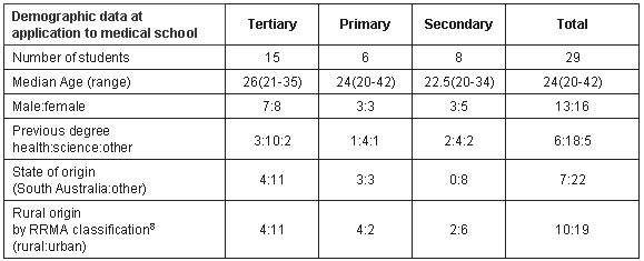 This study formed part of a comprehensive case-study of the three teaching locations conducted from 1998 to 2002. The 1998 Year 3 cohort was chosen for this part of the study. All six students in the PRCC, and ten at Darwin were invited to participate. Sixteen students were chosen by the Department of Medical Education to match these students in terms of age, gender, rural origin and previous academic study, and also invited to participate. For simplicity, the three locations will be referred to as the primary, secondary and tertiary sites.