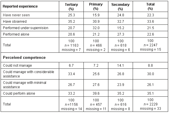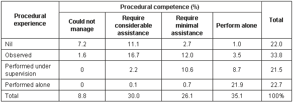 Table 3 demonstrates that there is a significant correlation between reported experience and perceived competence among all students (Spearman's rho = 0.69, p < 0.001). Students who had some hands-on experience with a procedure rated themselves as competent to perform that procedure with, at the most, minimal assistance in 95% of the cases (c2 = 842.75, 1df, p < 0.001). There was no clear relationship, however, in the 34% of cases when the student had only observed the procedure.