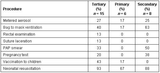Importantly, although not having seen a procedure at all was associated with a lack of perceived competence in 83% of cases (c2 = 520.16, 1df, p < 0.001), students did report competence to perform a procedure alone in 5% of the cases when they had not seen the procedure at all. These procedures included mouth-to-mouth, and mouth-to-bag, ventilation for all three locations; vaginal swabs, vaccinating a child, and incision and drainage of an abscess in the tertiary hospital; and using a rotohaler and controlling epistaxis in primary care.