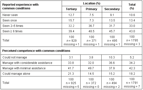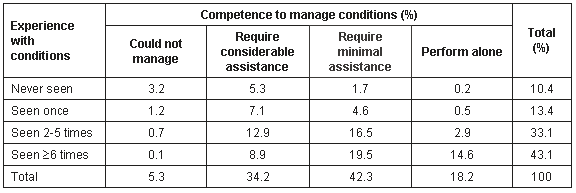 It is clear from Table 6 that, for the cohort as a whole, greater experience is correlated with greater self-reported competence to manage conditions (Spearman's rho = 0.476, p < 0.001). However, in addition to the differences noted previously between the locations, there are significant exceptions that prevent this being a simple ordinal relationship. For example, in 18% of the cases not seen by students there was a preparedness to manage the condition with, at the most, minimal assistance.