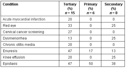 As with the results for procedures, a pattern emerged of primary care students reporting greater reported clinical experience with common conditions than their tertiary peers (Table 5; Wilcoxon W = 579319, Z = -4.347, p < 0.001).