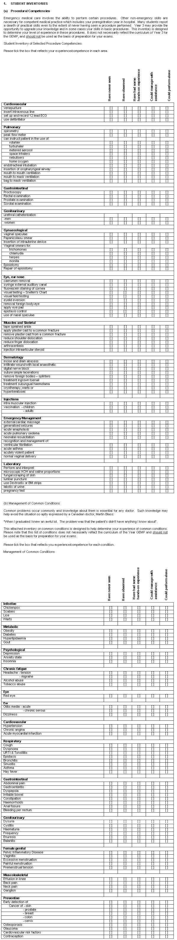 The 'Confidence in common procedures and conditions' survey instrument3 investigated both the reported 'experience' of patient-related opportunities available to the student and the perceived 'outcome' of confidence in managing common conditions. Eight items were added to this instrument due to their importance to Year 3 at Flinders University. The instrument then consisted of 140 items: 78 common procedures and 62 common conditions. This list of 140 items was agreed to, by the specialist disciplines, as being indicative of the core skills and conditions for a Year 3 student (Appendix I).