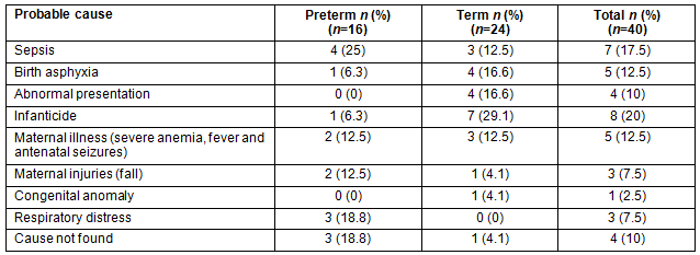 There were 22 early neonatal deaths and 18 stillbirths. Of the early neonatal deaths, 63.6% happened within 24 hours of birth. The probable causes of perinatal deaths based on verbal autopsy are shown in Table 1.