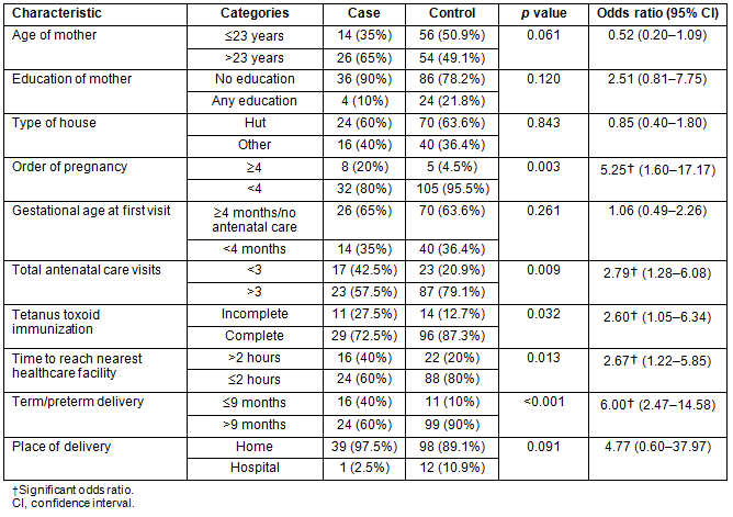 During the study period from 1 February to 30 July 2012, 288 births and 43 perinatal deaths were reported with a perinatal mortality rate of 149.3/1000 births (95% CI for perinatal mortality rate is 107-190/1000 births). Data were collected from 40 cases and 110 controls. Information was not obtained from three cases and ten controls as they had migrated or were not available at their home during the time of interview.