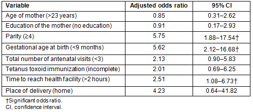 A logistic regression model was generated by including age of mother, education of mother, preterm/term, time to reach nearest health facility >2 hours, total number of antenatal visits (<3), immunization with tetanus toxoid (incomplete) and place of delivery (home) as the independent variables (Table 3). In the final model, parity ≥4 (OR 5.75 [95% CI 1.88-17.54]), preterm births (OR 5.62 [95% CI 2.12-16.68]) and time to reach the nearest health facility more than 2 hours (OR 2.51 [95% CI 1.08-6.73]) were significantly associated with the perinatal deaths.