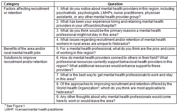 Following Krueger's recommended focus group methodology20, a semi-structured question guide was developed consisting of nine open-ended questions to explore the perceptions of the participants in relation to three categories (Table 1): factors affecting recruitment or retention of mental health providers in the participants' region, benefits of the area and/or of rural mental health jobs, and solutions to improve recruitment and/or retention of mental healthcare providers in the participants' region or the state. Twelve focus groups were conducted from November 2012 to March 2013. Each 60-to-90 minute group took place in a meeting room at the regional mental health office, a hospital, or a community provider group office. The focus groups were facilitated by one of the authors. Another author observed all groups.