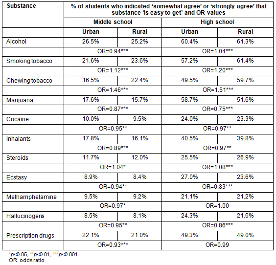 Odds ratios were calculated to compare perceived ease of access to each substance between rural and urban students. Analyses stratified into middle school (grades 6-8) and high school (grades 9-12) were conducted to allow for separate examination of each school level. Stratified analyses were chosen due to the previously demonstrated relationship between age and perceived access to substances3; by separately examining middle and high school students, conclusions regarding differences across broad age groups are possible. In addition, substance use prevention programs and interventions are likely to be implemented at the school level, and understanding any potential differences by school level may be beneficial in intervention planning.