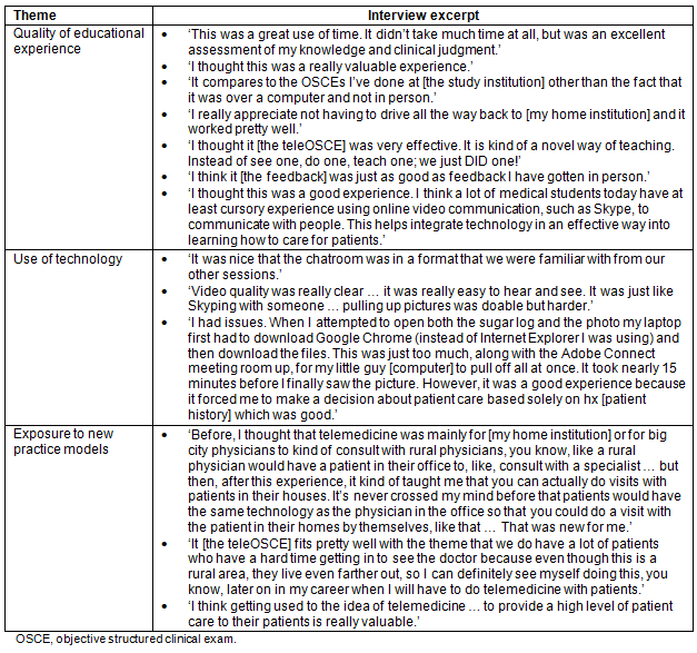 Transcript coding of student interviews revealed the teleOSCE to be an educational activity of acceptable quality and importance. Coding themes are illustrated in Table 2.
