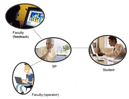 Figure 1: Each objective structured clinical exam participant connects to the meeting room from a separate location via the internet with a laptop computer and a cell phone. All interactions take place online in an Adobe Connect virtual meeting room.