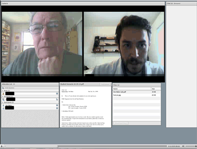 We used Adobe Connect online meeting software as the teleOSCE 'exam room'. Adobe Connect enables multiple live video and audio feeds as well as the ability to access documents from inside the digital meeting room, making it an ideal platform for a telemedicine simulation. RSP students were already familiar with the Adobe Connect technology, having used it for other curricular requirements in the program. Each student was given a specific appointment time to connect with the SP via the internet in the virtual exam room. One non-clinical faculty member served as the meeting operator to provide technical support for the session, and a clinical faculty member served as the observer. Each encounter lasted 20 minutes, with 15 minutes for the clinical encounter and 5 minutes for feedback. From four separate locations learners, faculty members and the SP all participated in the teleOSCE from their own computers and cell phones. Figures 1 and 2 illustrate the teleOSCE setup.