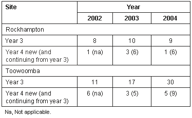 The rural clinical division has two schools, one in Rockhampton (central Queensland) and one in Toowooomba (south west Queensland), based in and around the regional hospitals in the two towns. For both sites the number of students spending 3rd year and 4th year there is shown (Table 1).