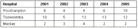 As student placements started in 2003 we collected data from 2001 onwards to allow a time series analysis before and after the development of the schools. We also collected similar data from Mackay Hospital (on the central Queensland coast) as an external control as the rural clinical division does not have a presence there. We did not collect data for Townsville and Cairns because of the confounding effect on these sites of the activity of the University of Queensland Northern Clinical School and subsequently the James Cook University Medical School.
