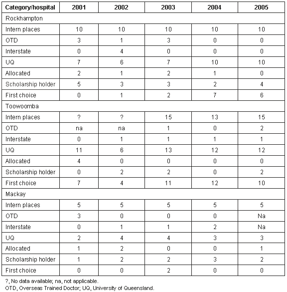 Rockhampton Hospital offered 10 intern places each year between 2001 and 2005 (Table 3). University of Queensland graduates filled six or seven of these places between 2001 and 2003, while two interns were recruited from overseas in 2001 and three from interstate in 2002. University of Queensland graduates filled all intern places for 2004 and 2005. Excluding scholarship holders as a special (bonded) category, while in 2001 and 2002, zero and one intern chose to work at Rockhampton, in 2004 and 2005, seven and six chose to work at this hospital. In contrast to all previous years, in 2005 no interns were allocated to Rockhampton.