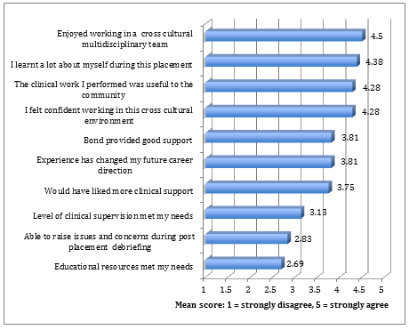 Respondents (n=16) indicated they did not have sufficient opportunity to raise their issues and concerns in the post-placement debriefing experiences (mean 2.83). They asked for opportunities for personal as well as professional debriefing sessions, as well as telephoned sessions weekly during the rotation. This issue was addressed during 2014 and a mobile phone was provided for students to call their clinical supervisor in Australia. Many students used it daily, some weekly: