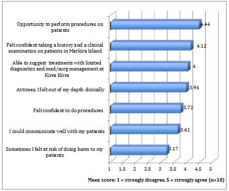 Clinically, student respondents (n=18) perceived that they could communicate well with their patients (mean 3.61), they were confident in taking a history and performing a clinical examination (mean 4.12) and they were able to suggest appropriate treatments, given the limited diagnostic and medical surgical management at Kirakira Hospital (mean 4.00). Respondents (n=18) also believed they had very good opportunities to perform procedures on their patients (mean 4.44), and they felt relatively confident to undertake these procedures (mean 3.72). Respondents agreed that at times they felt out of their depth clinically (mean 3.94) and at times they felt at risk of doing harm to their patients (mean 3.17). They reported good exposure and hands-on experience in obstetrics and paediatrics, and they reported opportunities to perform procedures that were not possible in Australia as a strength: