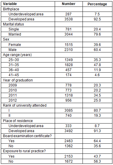 Normality of the distribution was checked using the Kolmogorov-Smirnov (K-S) test (p≥ 0.05, normal distribution). All 3825 graduated physicians who were mandated to perform compulsory community service were included in the study. As Table 1 shows, 60.4% of the physicians were male. The majority of the physicians were married (79.6%) and 80.7% of them graduated from type I medical schools. Most physicians were born and lived in developed areas (92.5% and 91.3%, respectively). Sixty-four percent of physicians had passed the specialty certification examination successfully. The mean age of the study population was 34 years (range, 27-50 years).