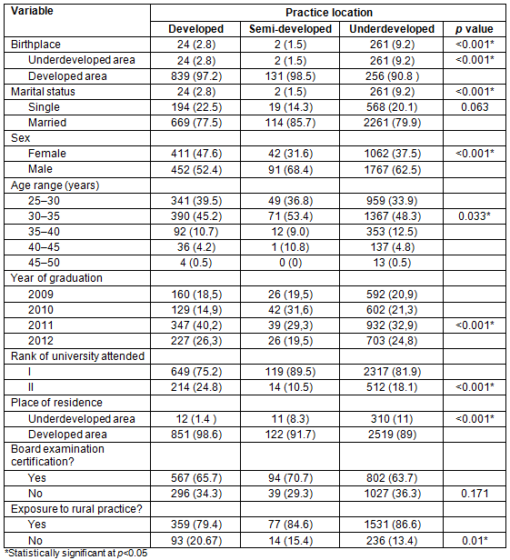 To explore the relationship between physicians' attributes and their choice of practice location, data were analyzed using χ2 test and multivariate logistic regression analysis with the assistance of Statistical Package for the Social Sciences software v18 (SPSS; http://www.spss.com). A p-value≤0.05 was considered statistically significant.