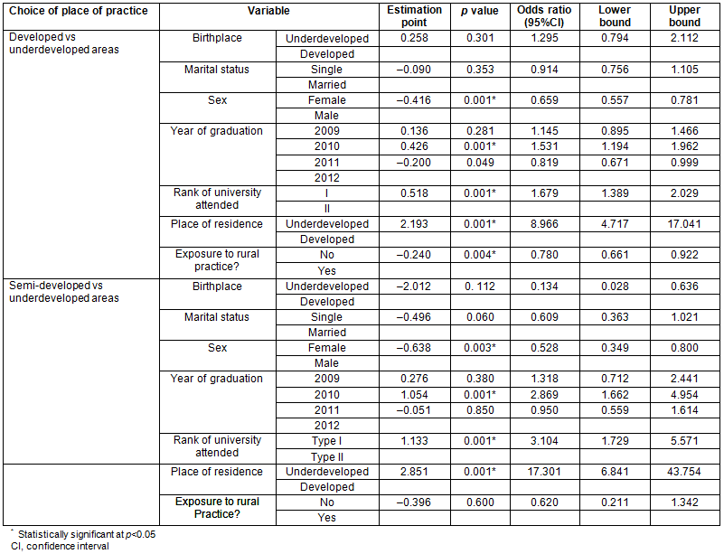 According to the regression logistic analysis, variables such as sex, year of graduation, rank of the university attended, and place of residence were significantly different in graduates whose first choice was a developed area as compared to those who selected to practise in a semi-developed area. Female physicians were more likely to select a developed area to practise as compared with male physicians (OR=0.528, 95%CI, 0.349-0.800, p=0.003). Physicians who lived in the underdeveloped areas were 17 times more likely to choose to practise in the underdeveloped areas as compared with those who lived in other parts of country (OR=17.301, 95%CI, 6.841-43.754, p≤0.001).