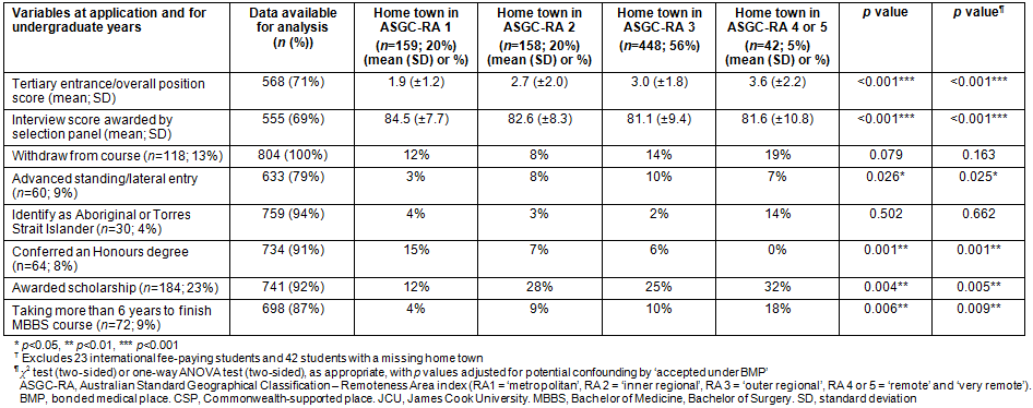 Having a rural or remote home town (RA 3-5) at application was significantly associated with a poorer tertiary entrance score expressed as OP (p<0.001), a lower interview score for medical school selection (p<0.001), being less likely to be admitted into the Honours program (p=0.001), being an advanced standing/lateral entry student (p=0.025), being awarded a rurally associated scholarship (p=0.005), and taking longer to complete the 6-year course (p=0.009), than their metropolitan or inner regional peers.
