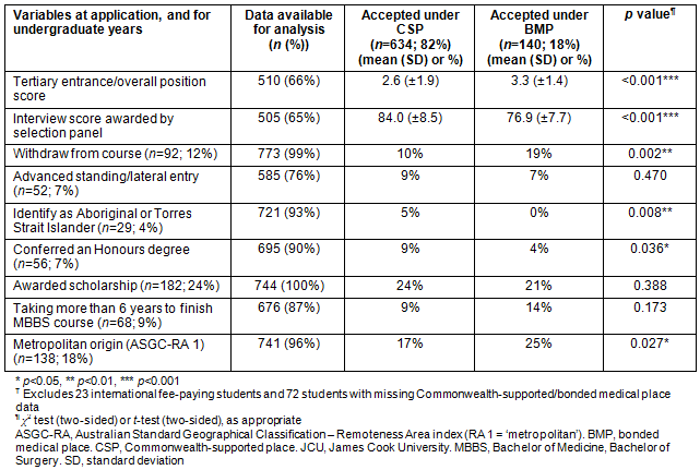 Being accepted under the BMP scheme rather than a CSP was significantly associated with students having a poorer tertiary entrance score expressed as OP (p<0.001), a lower interview score for medical school selection (p<0.001), withdrawing from the course (p=0.002), being less likely to identify as Aboriginal or Torres Strait Islander (p=0.008), being less likely to be admitted into the Honours program (p=0.036), and reporting a metropolitan home town at application to medical school (p=0.027).