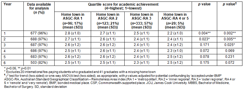Table 3: Associations between averaged quartile scores for overall academic achievement (4=highest academic quartile, 1=lowest academic quartile) and the home town of 707? graduates from the JCU MBBS program (graduating years 2005-2013)