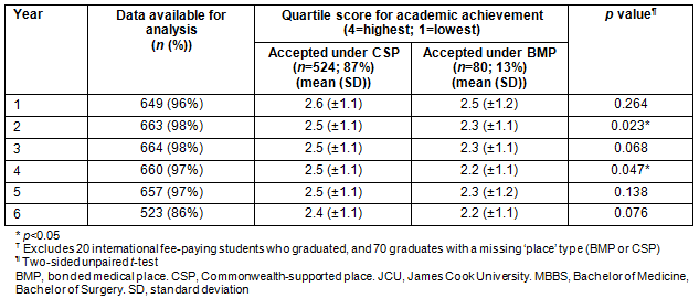 Table 4: Associations between averaged quartile scores for overall academic achievement (4=highest academic quartile, 1=lowest academic quartile) and the type of 'place' - Commonwealth-supported place or bonded medical place - given to 678? students who graduated from the JCU MBBS program (graduating years 2005-2013)