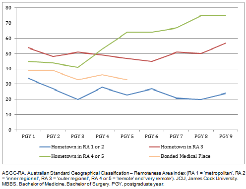In addition, graduates having a rural or remote hometown practise predominantly in rural and remote towns over the first nine postgraduate years - fulfilling the mission of the JCU medical school to produce medical graduates for rural and northern Australia14. This is in contrast to graduates from RA 1 or 2 towns who increasingly tend to return to urban areas over their postgraduate years. Thus, while a higher percentage of rural and remote origin JCU medical students are more likely to take an extra year to finish than the RA 1 or 2 students through failing and repeating a year, they do most often graduate and have similar academic abilities at graduation as the RA 1 or 2 students, suggesting that academic disadvantage evident at the beginning of the course is ameliorated through the support and learning opportunities available through the combination of the academic and the clinical environments.