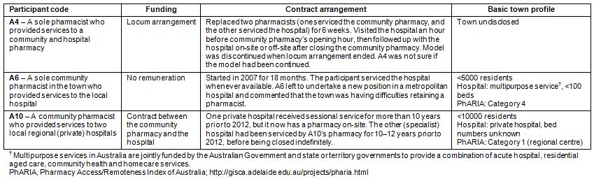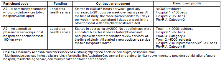 Preliminary research in a rural community in Queensland has revealed that part-time contracted ('sessional') pharmacy services, usually provided by the local community pharmacist, had been instigated to address medication management shortfalls in rural non-pharmacist hospitals16,19. This mirrors traditional models of rural general practitioners providing contracted services to their local public hospital ('cross-sector')1,8,20, but there are few such reported models for allied health providers21. Moreover, there is no known research into such models involving pharmacists.