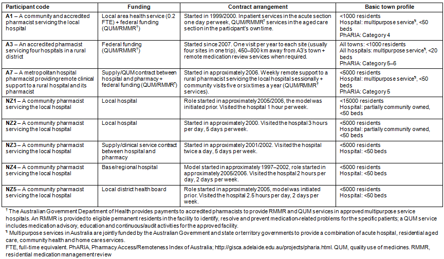 Based on the models described in Tables 1-3, the majority of the pharmacists involved were employed in the rural area as a community pharmacist or accredited pharmacist. This enabled greater frequency of face-to-face support to improve medication management and promote QUM, as opposed to infrequent or irregular outreach services limited by travel distances and costs as reported in other studies8,16,19. While there are similarities between the explored sessional models, variation was noted regarding funding, contractual arrangements and scopes of services. These were commonly tailored to meet the needs of the local rural community and the service providers (pharmacist and hospital). This reflects the notion that 'no one size fits all' in rural Australia27.