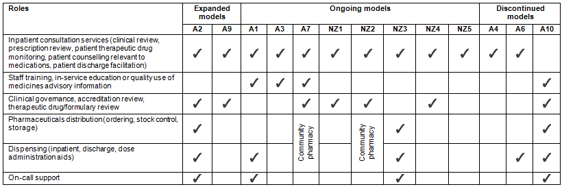 Of the 13 models, two had expanded into full-time positions (Table 1), eight were ongoing sessional positions (Table 2), and three had been discontinued (Table 3). At the time of service provision, participants A1, A2, A9, A10, NZ1, NZ2, NZ3, NZ4 and NZ5 were local members of their communities. Participants A4 and A6 had work experience in other rural communities. Participants A3 and A7 were located in a regional town and major city, respectively, with experience providing medication management services and support to rural communities.