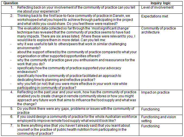 The 'most significant change' technique is used for evaluating complex interventions16. It involves the generation of significant change stories developed by the various participants and a process of prioritising the identified themes through focus group discussion16. The 'most significant change' technique was used to determine the major influence of the community of practice on the work of participants. At the completion of the 7-month community of practice, the participants were invited by the facilitators in an email to share the changes that they had experienced through involvement in the intervention. They were asked, 'Looking back over the last months, what do you think was the most significant change in your work in remote food supply that resulted from involvement in this community of practice, and why was this story significant for you?' Three participants wrote short stories which were de-identified and used for discussion by facilitators in the final group community of practice. The final discussion allowed open discussion, further story sharing by all participants about the most significant change to their practice as a result of participating in the community of practice and prioritisation of most significant change. The discussion lasted for 60 minutes and was recorded and later transcribed.