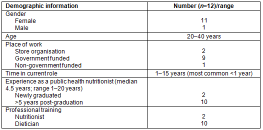 A total of 24 nutritionists expressed interest. Twelve potential participants were excluded. Of these, six were not given permission from their organisation to participate. Three did not have a role in working with stores and therefore did not meet the inclusion criteria, and three were interested in finding out the success of the community of practice after it was completed rather than being involved. Twelve eligible participants consented to be part of the community of practice and the study. Participant demographics (age, years of experience, qualifications, professional membership) and position descriptions were collected.