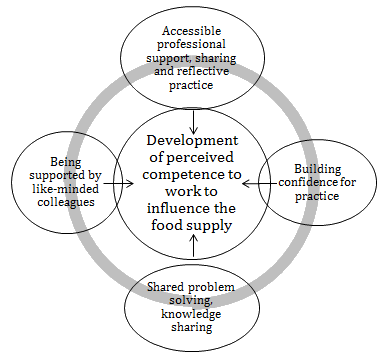 Communities of practice have been previously found to assist the public health workforce in evidence-informed decision making18. The findings from the present study support previous evidence that peer support and facilitated reflective practice can improve perceived competence and ability to improve population nutrition2. The present study also supports evidence on essential elements of communities of practice17. The formalised structure together with productive inquiry through critical questioning and hearing success stories were highly valued by participants.