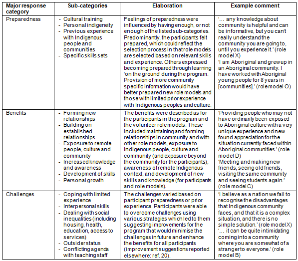 Various themes emerged in the interviews (Table 1), including influences on feelings of preparedness, the perceived reciprocity of the program (benefits for the participants and for the volunteer role models), the cultural learning derived from participation, the challenges encountered during the program and the associated personal development, and the suggestions for improvement that would reduce the challenge or increase the benefit. The focus of this article is the outcomes for volunteer role models, hence the predominant themes of 'benefits' and 'learning for role models' are elaborated.
