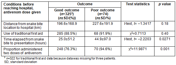 Table 1: Comparing good and poor outcomes of snakebite victims: distance from hospital, traditional first aid, and time elapsed before presentation to hospital