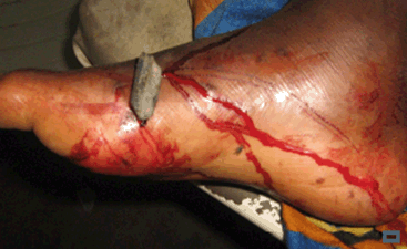 A study of carpet viper bites in the north-eastern Nigeria/northern Cameroon border area also reported a relationship between poor outcome and increased time between bite and presentation to hospital15. Use of TFA was more common following bites further away (≥100 km) from hospital, indirectly predisposing to poor outcome. Furthermore, use of TFAs such as tourniquets often causes increased local tissue effects of necrosis and compartment syndrome, resulting in ischemia and gangrene, especially following viper bites, which have venom moieties of relatively heavy molecular weights16. Use of black 'snake' stones (Fig1) in inaccessible rural agricultural communities with inadequate health care can lead to tetanus17. Use of tourniquets or black 'snake' stones after carpet viper envenoming have no benefit and cause delays and consequent poor outcomes16,18.
